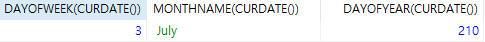 SELECT DAYOFWEEK(CURDATE()), MONTHNAME(CURDATE()), DAYOFYEAR(CURDATE());