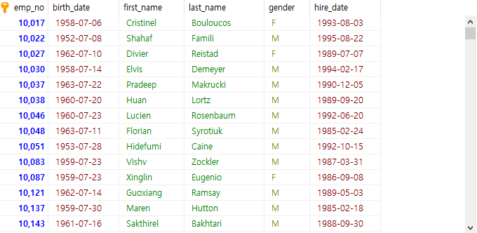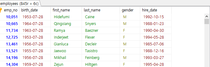 employees.employees에서 오늘 날짜 생일자 명단 출력