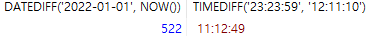 SELECT DATEDIFF('2022-01-01', NOW()), TIMEDIFF('23:23:59', '12:11:10');