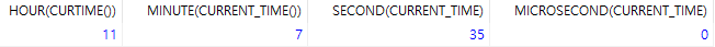 SELECT HOUR(CURTIME()), MINUTE(CURRENT_TIME()), SECOND(CURRENT_TIME),