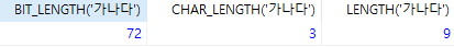 SELECT BIT_LENGTH('가나다'), CHAR_LENGTH('가나다'), LENGTH('가나다');