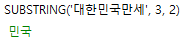 SELECT SUBSTRING('대한민국만세', 3, 2);