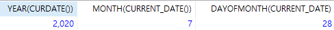 SELECT YEAR(CURDATE()), MONTH(CURRENT_DATE()), DAYOFMONTH(CURRENT_DATE);