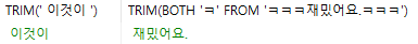 SELECT TRIM(' 이것이 '), TRIM(BOTH 'ㅋ' FROM 'ㅋㅋㅋ재밌어요.ㅋㅋㅋ');